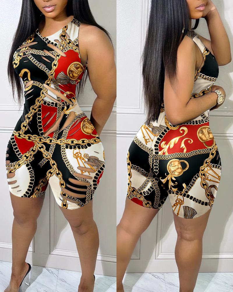 Scarf Chain Print Cutout Sleeveless Skinny Romper