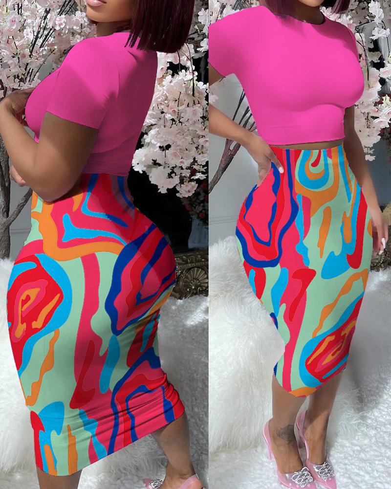 Multi Colors Abstract Print Top & High Waist Skirt Set