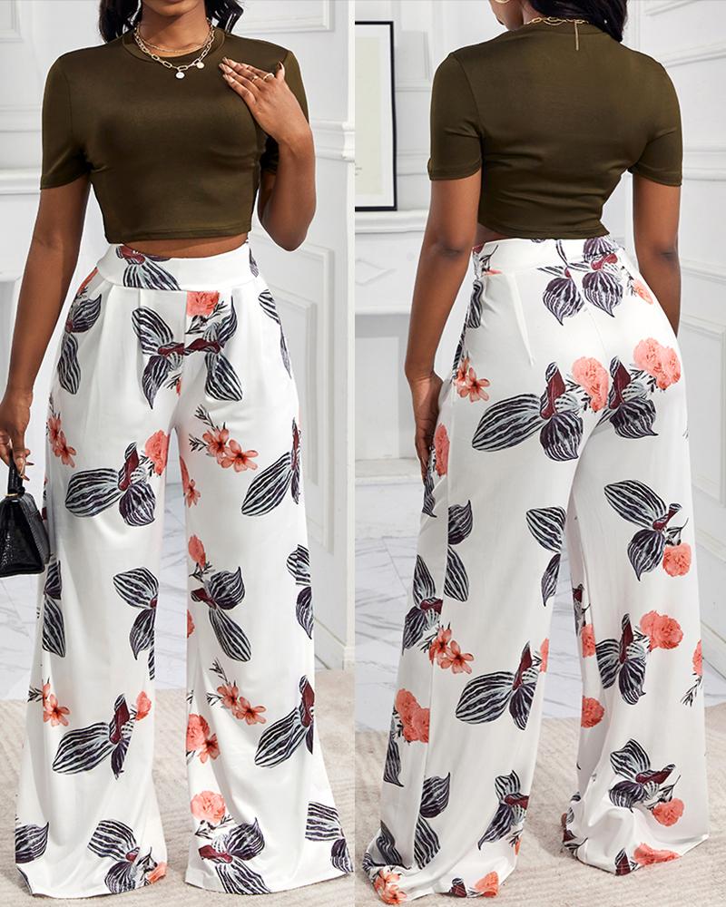 O-neck Crop Top & Floral Print Wide Leg Pants Set
