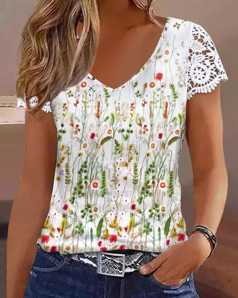 Style:Casual Type:Tee Material:95%Polyester,5%Spandex Neckline:V-Neck Sleeve Style:Short Sleeve Length:Regular Pattern Type:Plants Decoration:Contrast Lace Fit Type:Regular Occasion:Daily,Vacation Package Include:1*Top Fabric Elasticity:Non-Stretch Sleeve Type:Cap Sleeve Sheer:No Care Instructions:Machine wash or professional dry clean