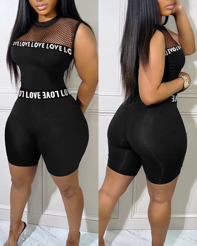 Letter Band Patch Fishnet Design Top & Shorts Set