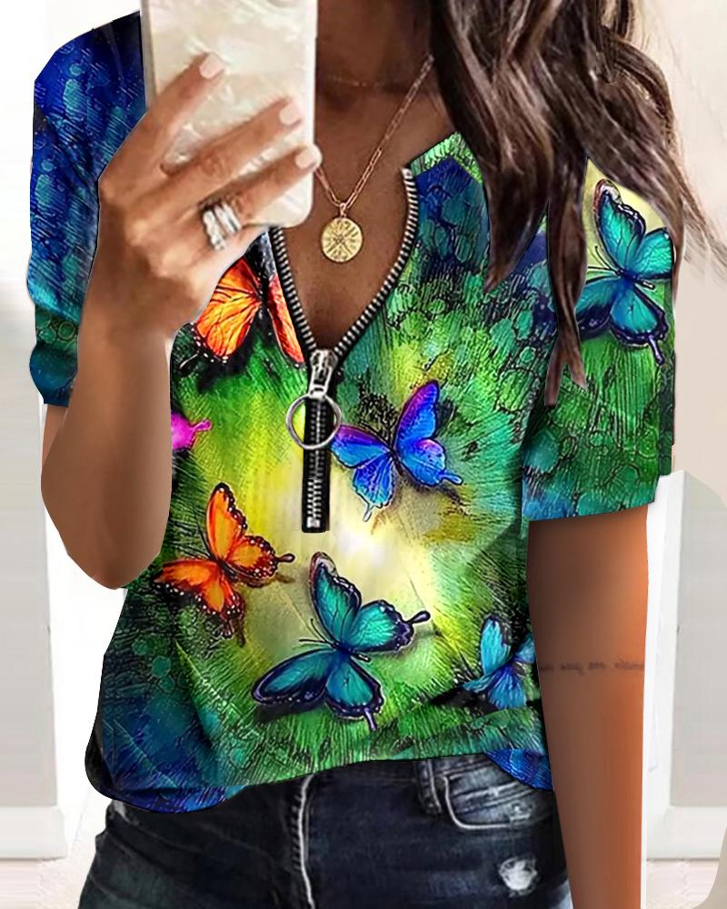Style:Casual Type:Tee Material:95%Polyester,5%Elastane Neckline:Round Neck Sleeve Style:Short Sleeve Length:Regular Pattern Type:Butterfly Decoration:Zipper Fit Type:Regular Occasion:Daily Package Include:1*Top Fabric Elasticity:Slight Stretch Sheer:No Care Instructions:Machine wash or professional dry clean