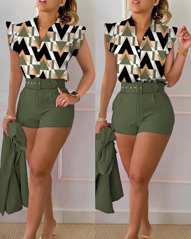 Geometric Print Flutter Sleeve Top & Shorts Set