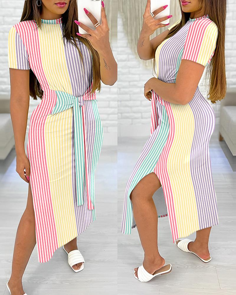 Striped Colorblock Knotted Side Slit Casual Dress