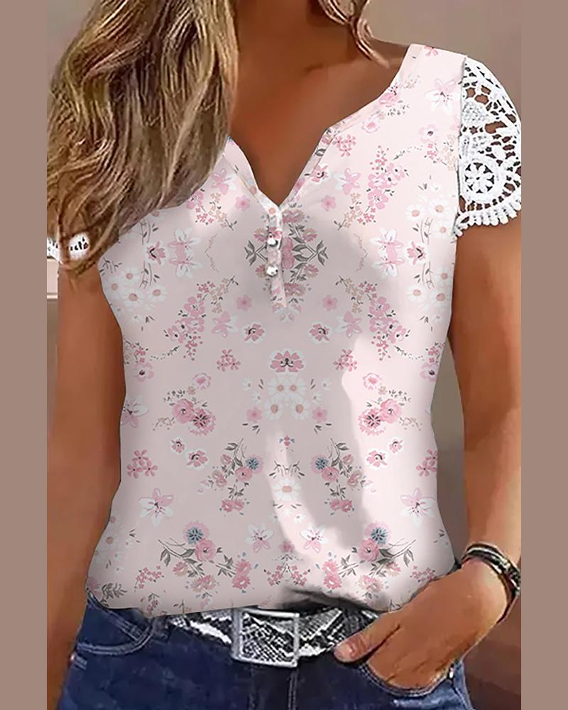 Style:Casual Type:Tee Material:95%Polyester,5%Spandex Neckline:Notch Neck Sleeve Style:Short Sleeve Length:Regular Pattern Type:Ditsy Floral Decoration:Contrast Lace Fit Type:Regular Occasion:Daily Package Include:1*Top Fabric Elasticity:Non-Stretch Sheer:No Care Instructions:Machine wash or professional dry clean