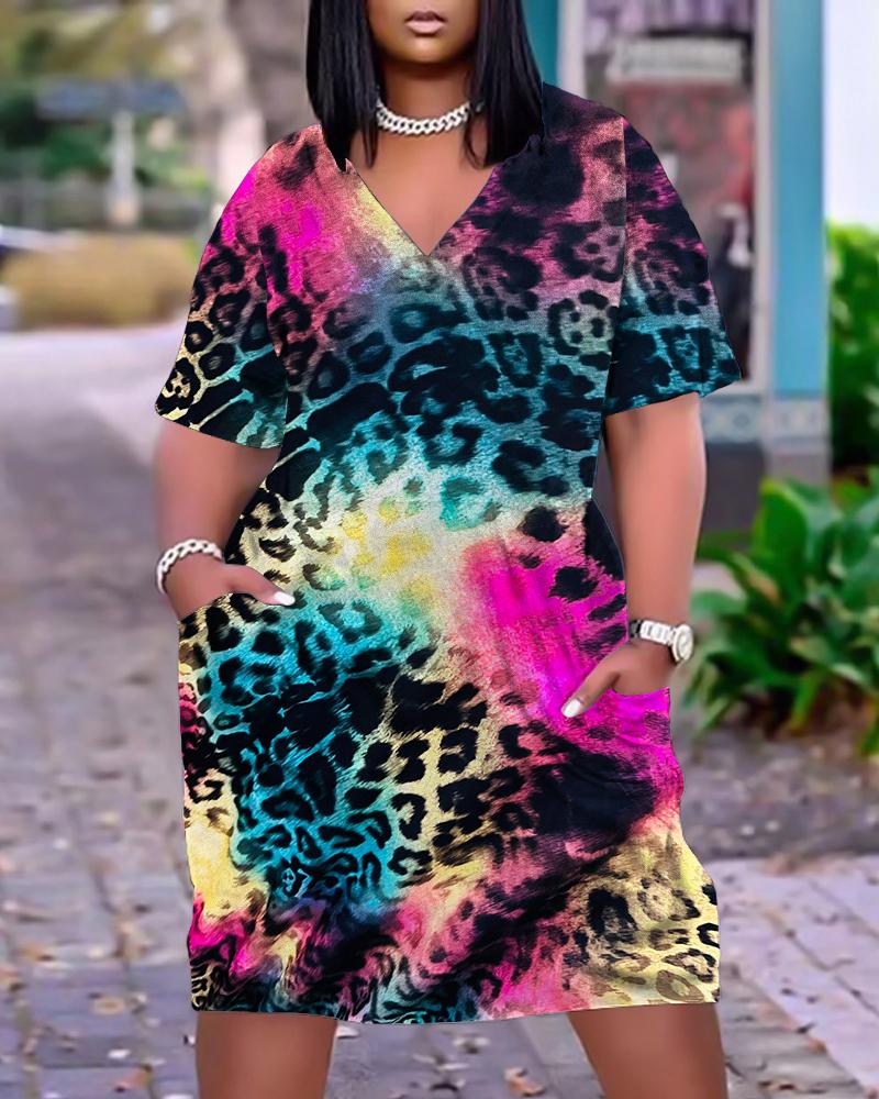 Style:Casual,Chic Type:Straight Material:Polyester Neckline:V-Neck Sleeve Style:Short Sleeve Length:Knee-Length Pattern Type:Ombre,Leopard Decoration:Pocket Fit Type:Regular Occasion:Daily,Night Out Package Include:1* Dress Fabric Elasticity:Slight Stretch
