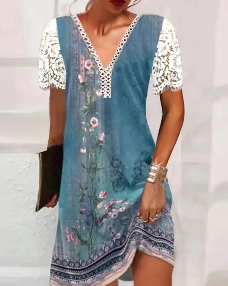 Style:Casual,Chic Type:A Line Material:Polyester Neckline:V-Neck Sleeve Style:Short Sleeve Length:Mini Pattern Type:Floral,Tribal Decoration:Contrast Lace Fit Type:Regular Occasion:Daily Package Include:1*Dress Fabric Elasticity:Slight Stretch Sheer:No Care Instructions:Machine wash or professional dry clean Waist Line:Natural