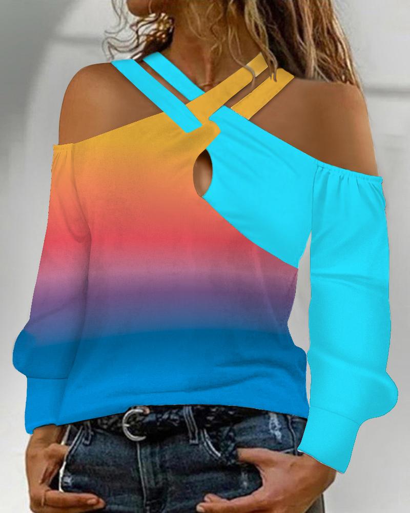 Style:Casual Type:Tee Material:Polyester Neckline:Cold Shoulder Sleeve Style:Long Sleeve Length:Regular Pattern Type:Ombre,Tie Dye Decoration:Criss Cross Fit Type:Regular Occasion:Daily Package Include:1*Top Fabric Elasticity:Slight Stretch Sheer:No Care Instructions:Machine wash or professional dry clean