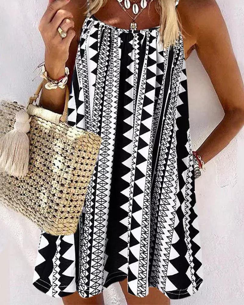 Style:Casual,Chic Type:A Line Material:Polyester Neckline:Round Neck Sleeve Style:Spaghetti Strap Length:Above Knee Pattern Type:Geometric Decoration:Others Fit Type:Regular Occasion:Daily Package Include:1* Dress Fabric Elasticity:Non-Stretch Sheer:No Care Instructions:Machine wash or professional dry clean Waist Line:Natural
