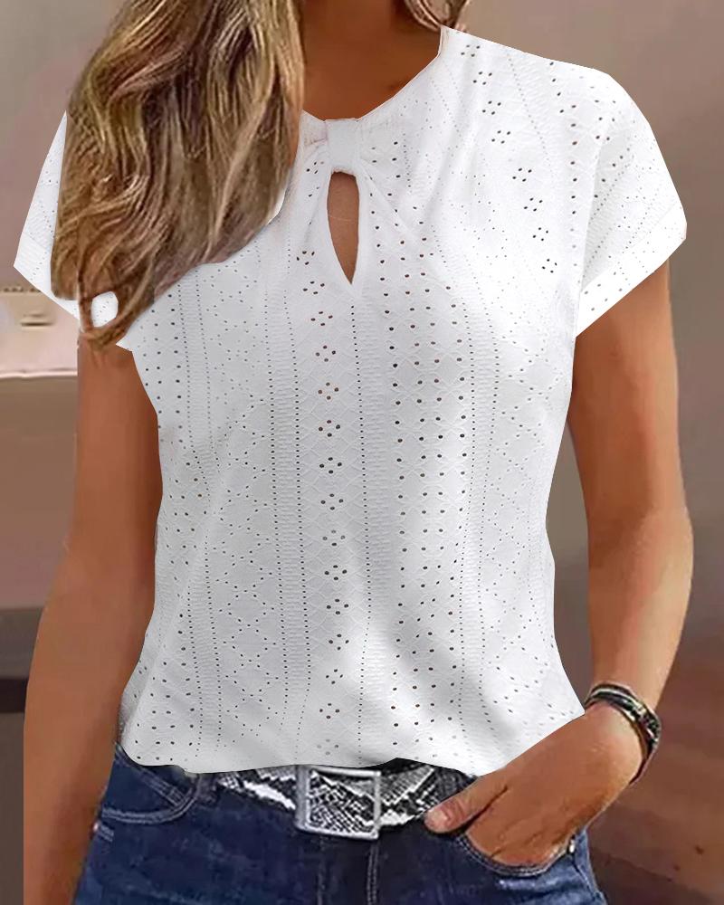 Style:Chic Type:Tee Material:95%Polyester,5%Spandex Neckline:Keyhole Neck Sleeve Style:Short Sleeve Length:Regular Pattern Type:Plain Decoration:Eyelet Embroidery Fit Type:Regular Occasion:Daily,Vacation Package Include:1*Top Fabric Elasticity:Non-Stretch Sheer:No Care Instructions:Machine wash or professional dry clean