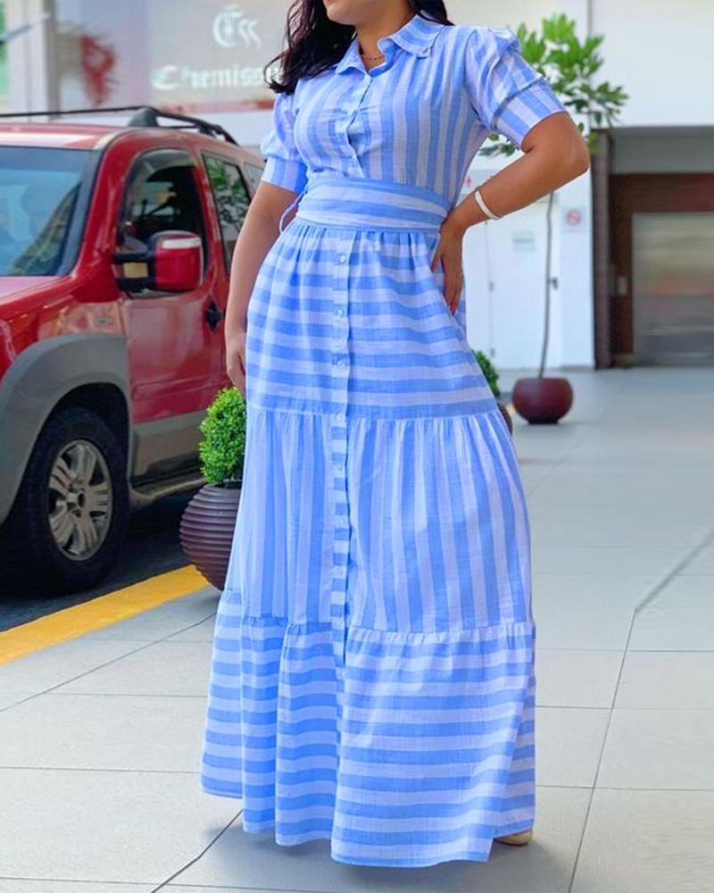 Style:Chic Type:A Line Material:100%Polyester Neckline:Turn-down Collar Sleeve Style:Short Sleeve Length:Maxi Pattern Type:Striped Decoration:Button Fit Type:Regular Occasion:Daily,Vacation Package Include:1* Dress Fabric Elasticity:Slight Stretch Hem Shaped:Flounce Sheer:No Care Instructions:Machine wash or professional dry clean Waist Line:Drop Waist