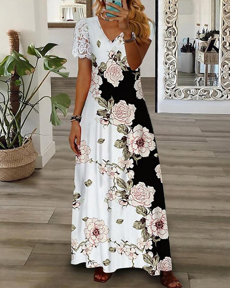 Style:Casual Type:A Line Material:Polyester Neckline:V-Neck Sleeve Style:Short Sleeve Length:Maxi Pattern Type:Floral Decoration:Contrast Lace Fit Type:Regular Occasion:Daily Package Include:1* Dress Fabric Elasticity:Slight Stretch Sheer:No Care Instructions:Machine wash or professional dry clean