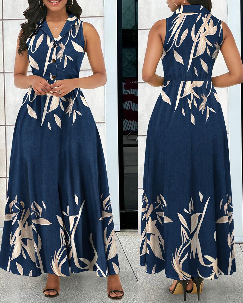 Style:Chic Type:Flared Material:100%Polyester Neckline:Notched Collar Sleeve Style:Sleeveless Length:Maxi Pattern Type:Plants Decoration:Button Fit Type:Regular Occasion:Daily Package Include:1* Dress Fabric Elasticity:Slight Stretch Sheer:No Care Instructions:Machine wash or professional dry clean Waist Line:High Waist