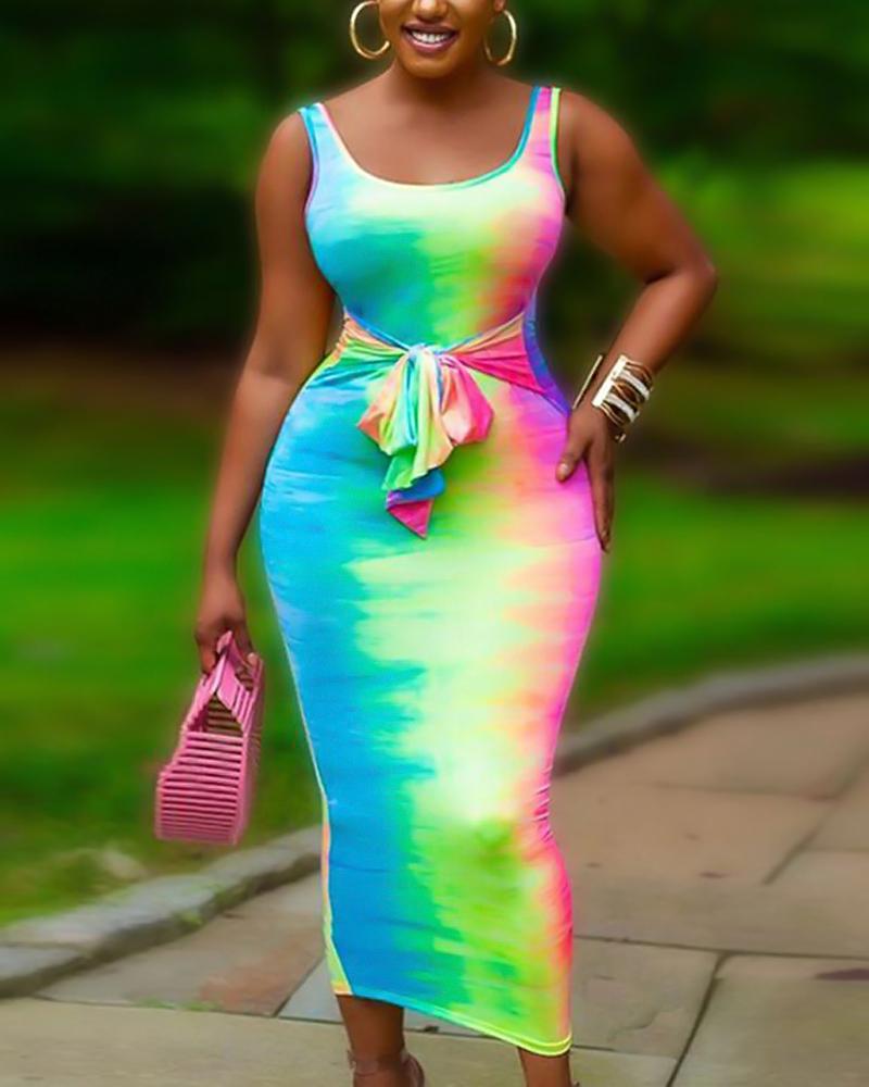 Style:Chic Type:Bodycon Material:95%Polyester,5%Elastane Neckline:U-Neck Sleeve Style:Sleeveless Length:Mid-Calf Pattern Type:Tie Dye Decoration:Tied Detail Fit Type:Skinny Occasion:Daily Package Include:1* Dress Fabric Elasticity:Non-Stretch Sheer:No Care Instructions:Machine wash or professional dry clean