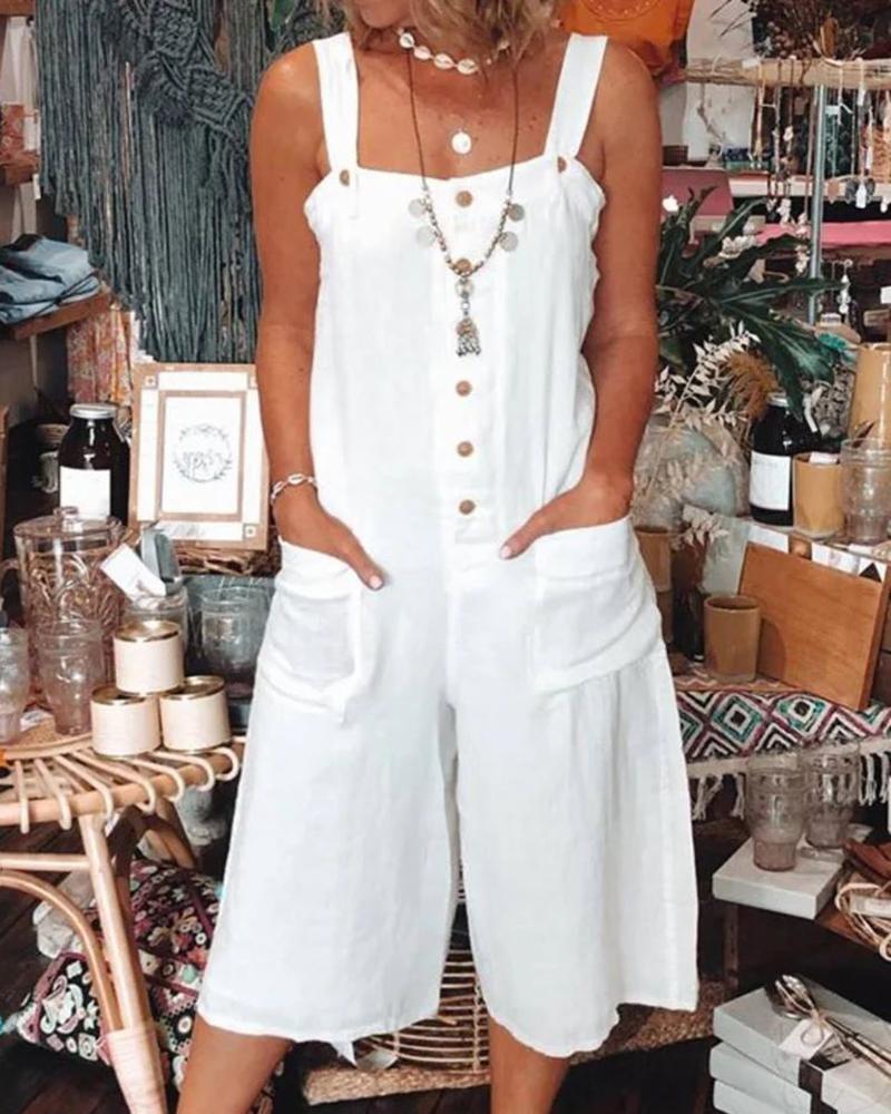 Style:Basics,Casual Type:Jumpsuit Material:Polyester Neckline:Square Neck Sleeve Style:Thick Strap Length:Capris Pattern Type:Plain Decoration:Button,Pocket Fit Type:Regular Occasion:Daily Package Include:1*Jumpsuit