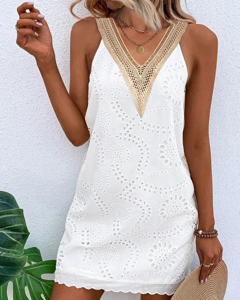 Style:Casual Type:Straight Material:Polyester Neckline:V-Neck Sleeve Style:Sleeveless Length:Mini Pattern Type:Contrast Paneled Decoration:Contrast Lace,Eyelet Embroidery Fit Type:Regular Occasion:Daily Package Include:1* Dress Fabric Elasticity:Non-Stretch Sheer:No Care Instructions:Machine wash or professional dry clean Waist Line:Natural