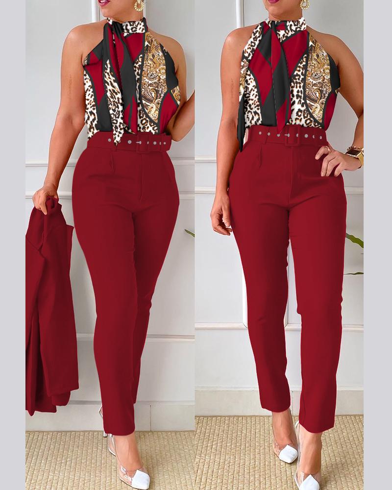 Style:Chic Type:Pants Sets Material:95%Polyester,5%Elastane Neckline:Tie Neck Sleeve Style:Sleeveless Length:Long Pattern Type:Baroque,Leopard Decoration:Tied Detail Fit Type:Regular With Belt:Yes Occasion:Daily,Work Package Include:1*Pants Set(Without Coat) Fabric Elasticity:Medium Stretch Sheer:No Care Instructions:Machine wash or professional dry clean Waist Line:High Waist