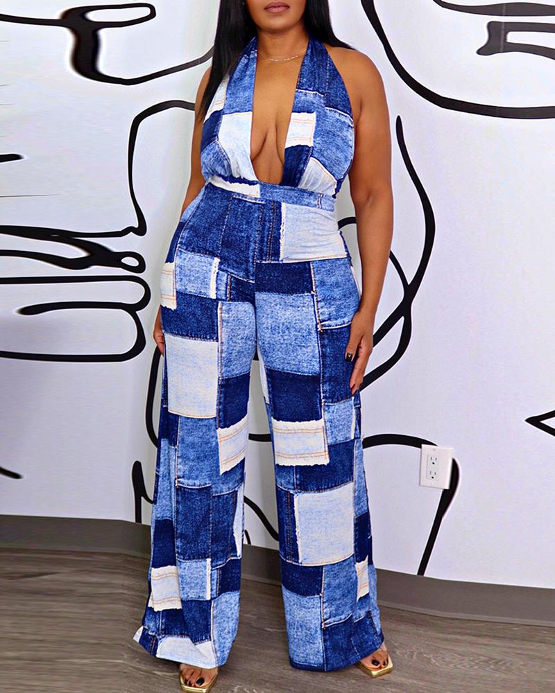 Denim Look Print Halter Backless Wide Leg Jumpsuit