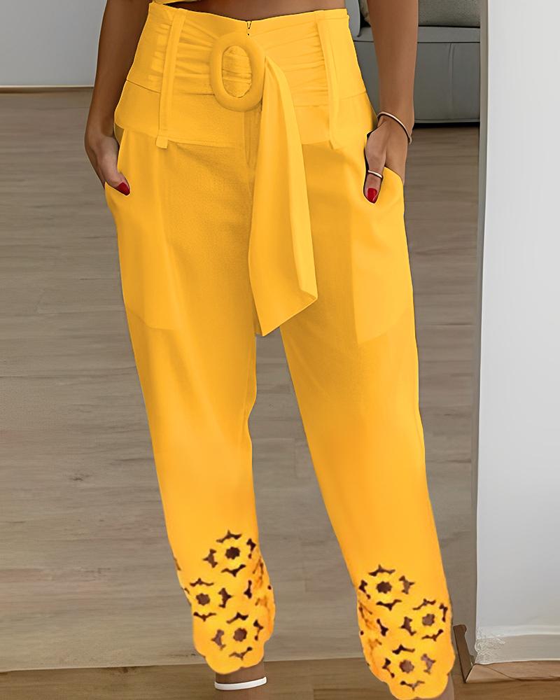 Style:Casual Type:High Waist Material:Polyester Length:Long Pattern Type:Plain Decoration:Hollow-out,Pocket Fit Type:Regular With Belt:Yes Occasion:Daily Package Include:1*Pants(With Belt) Fabric Elasticity:Non-Stretch Sheer:No Care Instructions:Machine wash or professional dry clean Waist Line:High Waist