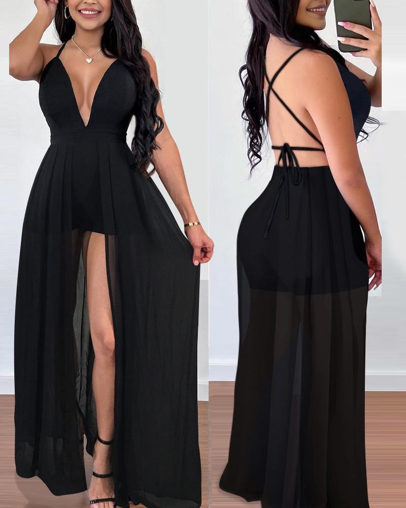 Scarf Chain Print Cutout Sleeveless Skinny Romper