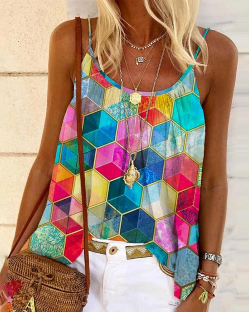 Style:Basics,Casual Type:Cami Material:Polyester Neckline:Scoop Neck Sleeve Style:Spaghetti Strap Length:Regular Pattern Type:Geometric Decoration:Ruched Fit Type:Regular Occasion:Daily,Vacation Package Include:1*Top