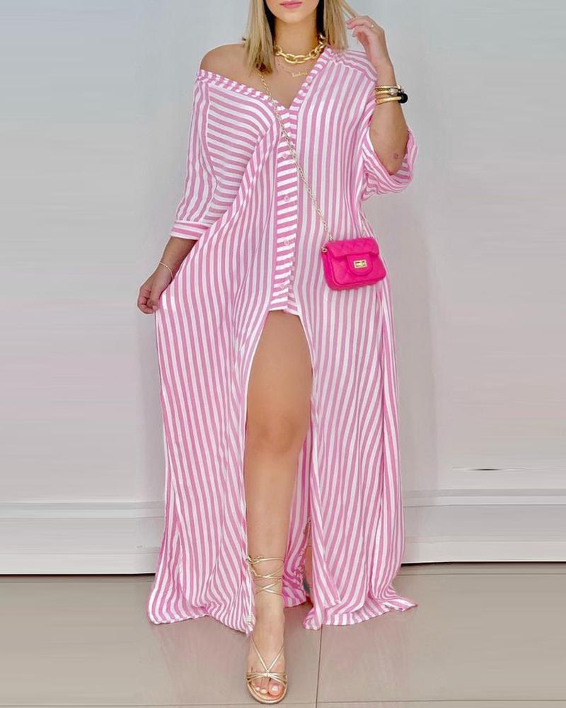 Style:Chic Type:Slit Material:Polyester Neckline:V-Neck Sleeve Style:Three Quarter Length Length:Maxi Pattern Type:Striped Decoration:Button,Pastel,Slit Fit Type:Regular Occasion:Daily Package Include:1* Dress Fabric Elasticity:Slight Stretch Sheer:No Care Instructions:Machine wash or professional dry clean