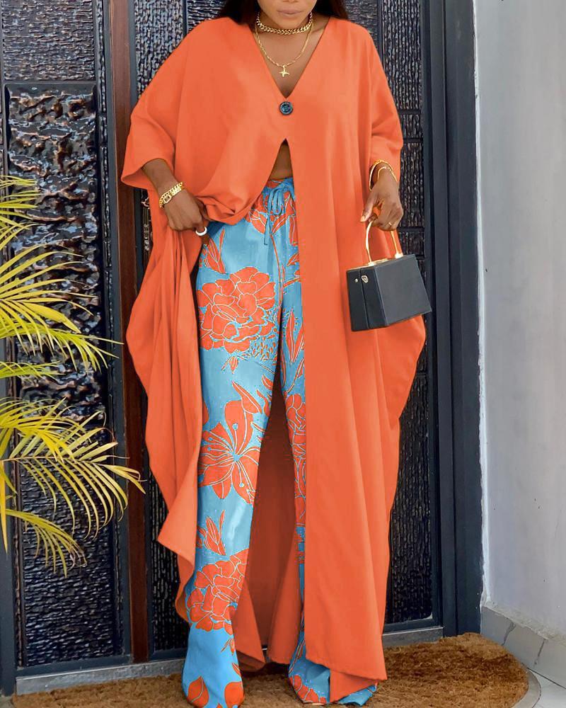 Style:Casual Type:Pants Sets Material:97%Polyester,3%Elastane Neckline:V-Neck Sleeve Style:Long Sleeve Length:Long Pattern Type:Plants Decoration:Slit Fit Type:Regular Occasion:Daily,Vacation Package Include:1*Pants Set