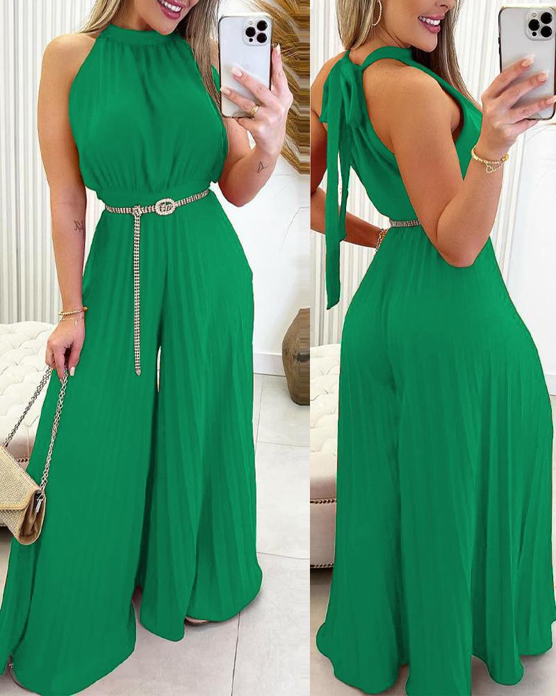 Style:Casual,Elegant Type:Jumpsuit Material:97%Polyester,3%Elastane Neckline:Halter Sleeve Style:Sleeveless Length:Long Pattern Type:Plain Decoration:Tied Detail Fit Type:Regular With Belt:No Occasion:Daily,Work Package Include:1*Jumpsuit (Without Belt) Fabric Elasticity:Non-Stretch Sheer:No Care Instructions:Machine wash or professional dry clean