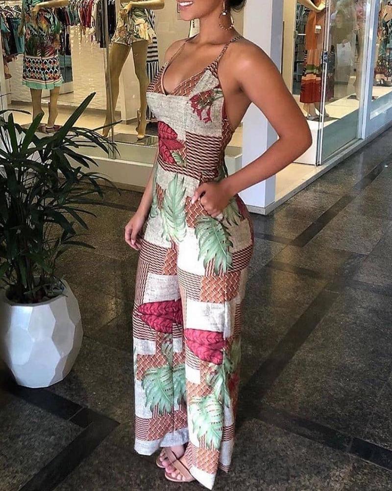 Style:Sexy Type:Jumpsuit Material:95%Polyester,5%Elastane Neckline:V-Neck Sleeve Style:Spaghetti Strap Length:Long Pattern Type:Tropical Fit Type:Regular Occasion:Daily Package Include:1*Jumpsuit