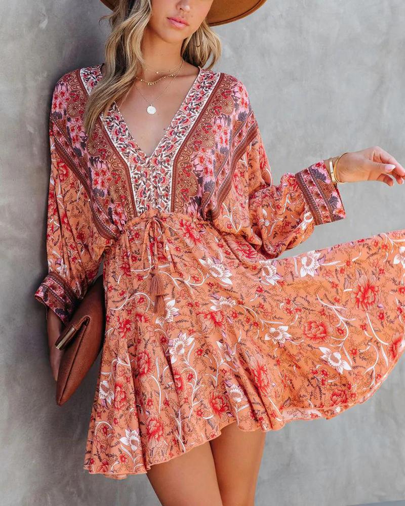 Style:Casual Type:A Line Material:97%Polyester,3%Elastane Neckline:V-Neck Sleeve Style:Batwing Sleeve,Long Sleeve Length:Mini Pattern Type:Floral Decoration:Drawstring,Tied Detail,Backless Fit Type:Regular Occasion:Daily,Vacation Package Include:1* Dress Fabric Elasticity:Slight Stretch