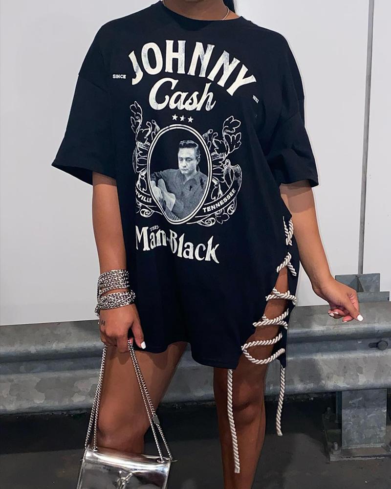 Graphic Print Side Lace-up Slit T-shirt