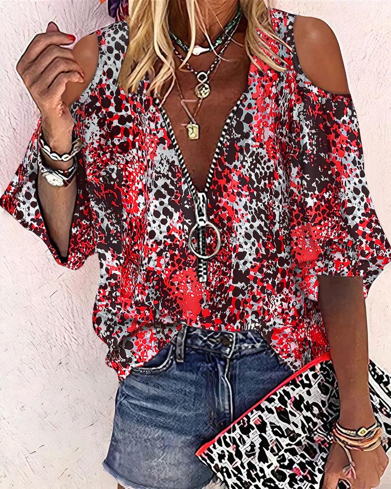 Style:Casual,Chic Type:Blouses Material:Chiffon Neckline:Cold Shoulder Sleeve Style:Lantern Sleeve,Three Quarters Length:Regular Pattern Type:Leopard Decoration:Lantern Sleeve,Zipper Fit Type:Regular Occasion:Daily Package Include:1* Blouse