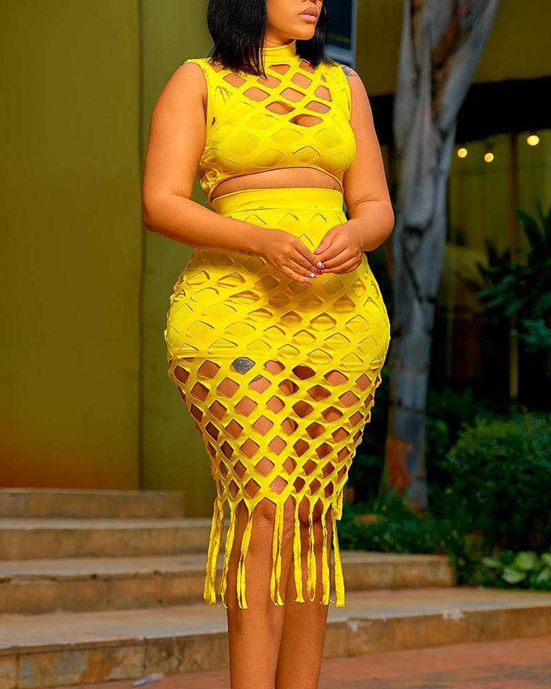 Hollow Out Crop Top & Tassel Design Skirt Set