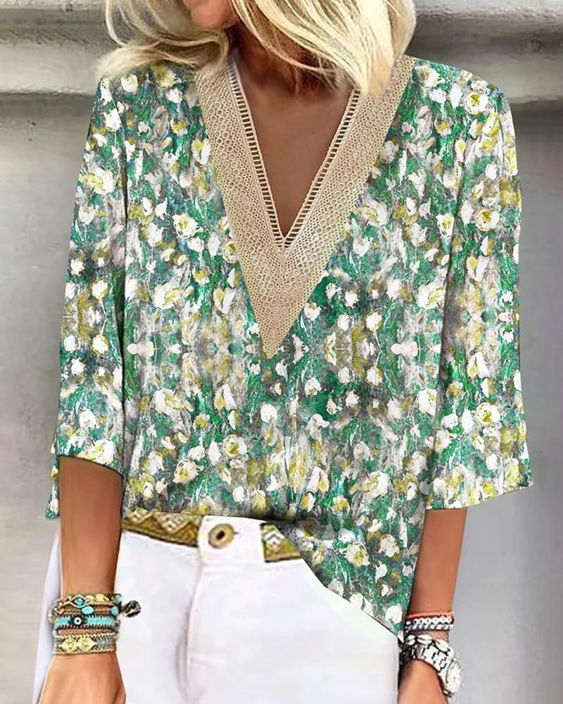 Style:Casual Type:Tee Material:97%Polyester,3%Elastane Neckline:V-Neck Sleeve Style:Three Quarters Length:Regular Pattern Type:Abstract Decoration:Contrast Lace Fit Type:Regular Occasion:Daily Package Include:1*T-Shirt Fabric Elasticity:Slight Stretch Sheer:Semi-Sheer Care Instructions:Machine wash or professional dry clean