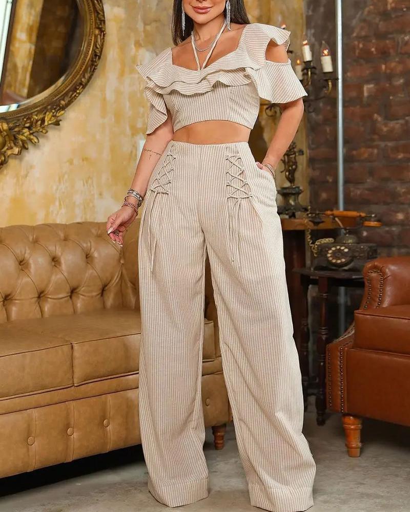 Striped Ruffle Hem Crop Top & Straight Leg Pants Set