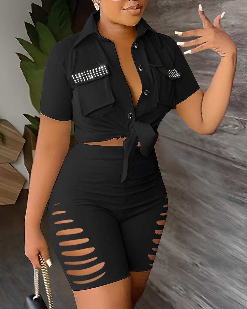 Rhinestone Pocket Design Crop Top & Ladder Cutout Shorts Set