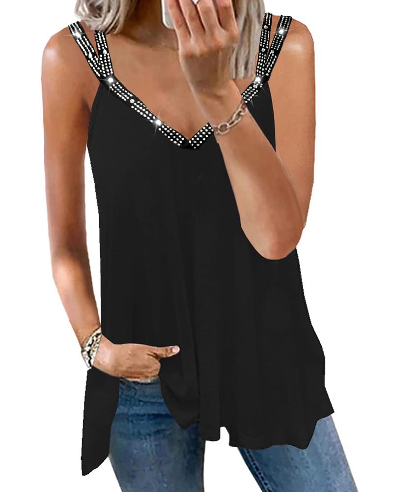 Style:Chic Type:Tank Neckline:V-Neck Sleeve Style:Sleeveless Length:Regular Pattern Type:Plain Decoration:Rhinestone Fit Type:Regular Occasion:Daily Package Include:1*Top