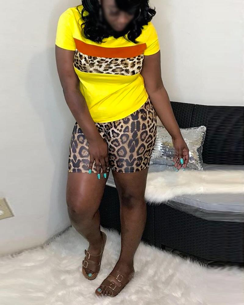 Style:Chic Type:Shorts Set Material:Polyester Neckline:Round Neck Sleeve Style:Short Sleeve Length:Above Knee Pattern Type:Colorblock,Leopard Decoration:Others Fit Type:Regular Occasion:Daily Package Include:1*Shorts Set Fabric Elasticity:Slight Stretch Sheer:No Care Instructions:Machine wash or professional dry clean Waist Line:High Waist
