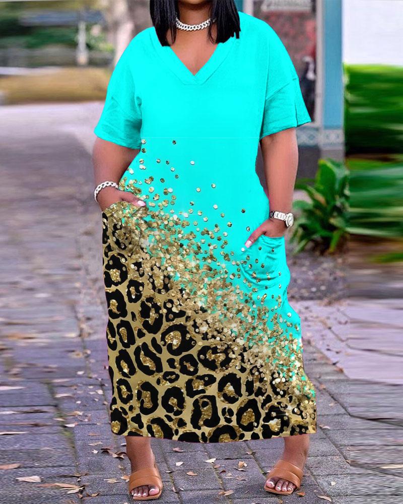 Style:Casual,Chic Type:Straight Material:95%Polyester,5%Elastane Neckline:V-Neck Sleeve Style:Short Sleeve Length:Maxi Pattern Type:Leopard Decoration:Pocket Fit Type:Oversized Occasion:Daily Package Include:1* Dress Fabric Elasticity:Slight Stretch Sheer:No Care Instructions:Machine wash or professional dry clean Waist Line:Natural