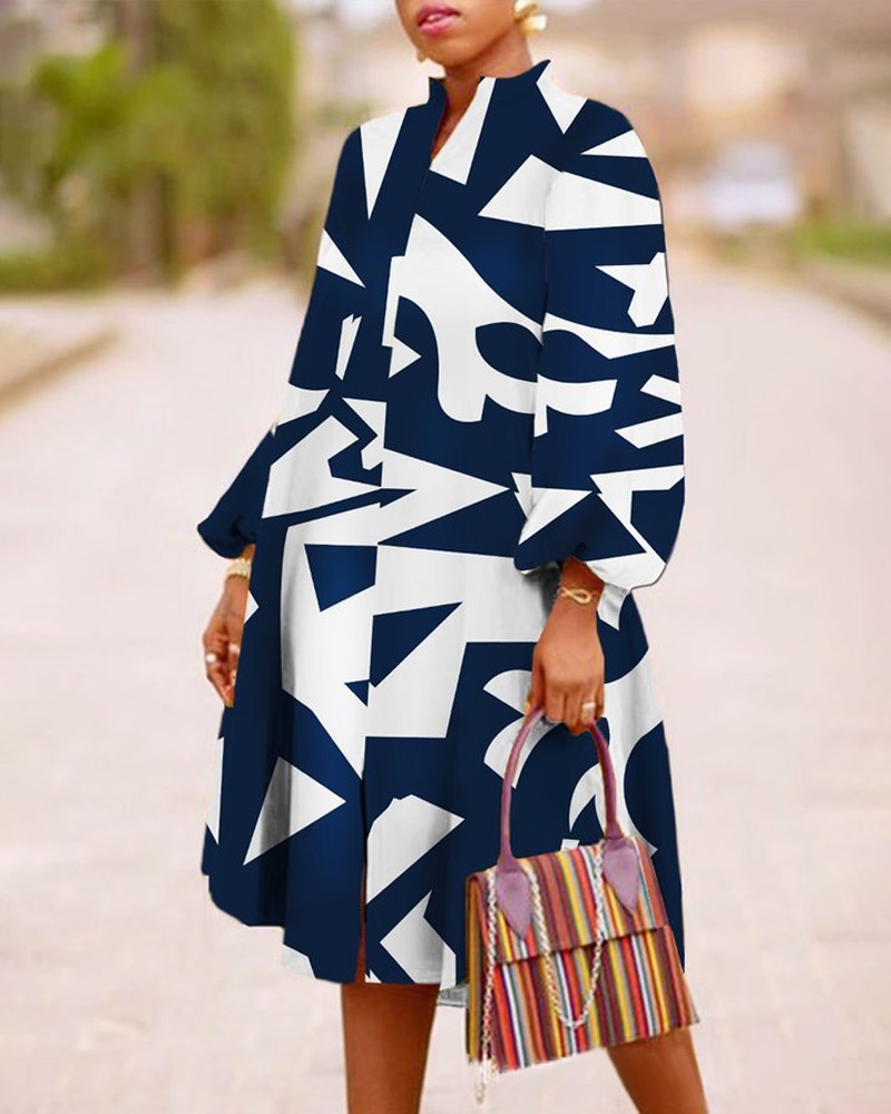 Geometric Print Lantern Sleeve Slit Casual Dress