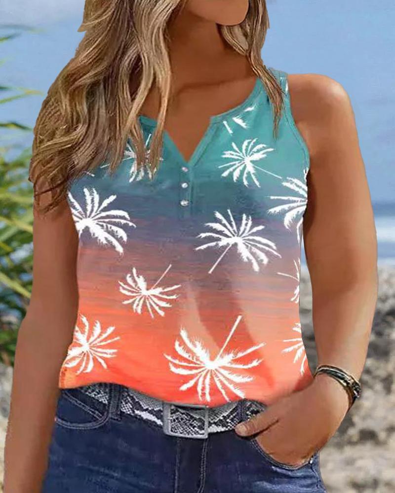 Plus Size Coconut Tree Print Ombre Notch Neck Tank Top