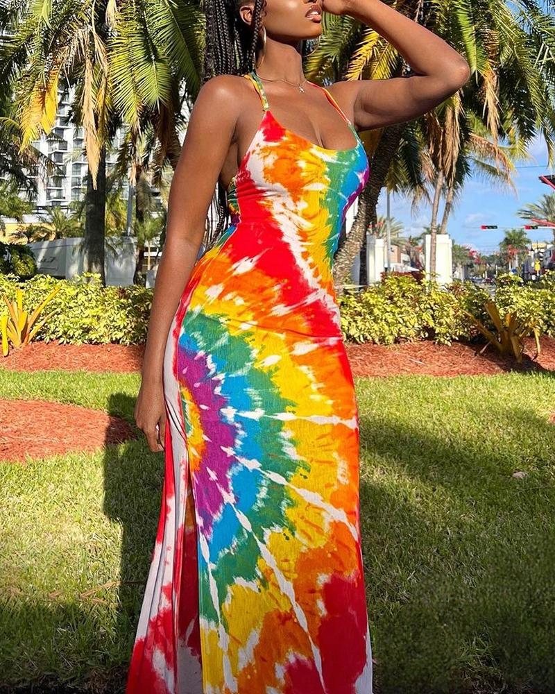 Style:Chic Type:Straight Neckline:U-Neck Sleeve Style:Spaghetti Strap Length:Maxi Pattern Type:Tie Dye Fit Type:Regular Occasion:Daily,Vacation Package Include:1* Dress Waist Line:Natural