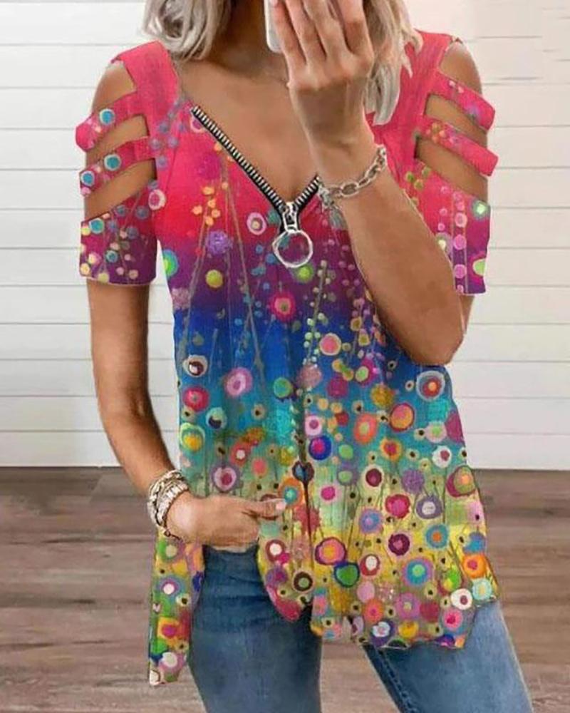 Style:Chic Type:Tee Material:95%Polyester,5%Elastane Neckline:O-neck Sleeve Style:Short Sleeve Length:Regular Pattern Type:Colorblock,Floral Decoration:Cutout,Zipper Fit Type:Regular Occasion:Daily Package Include:1*T-Shirt