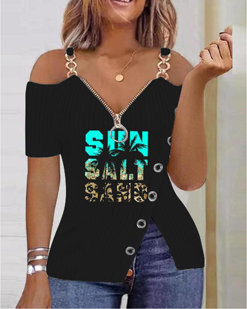 Style:Casual Type:Tee Material:Polyester Neckline:Cold Shoulder Sleeve Style:Short Sleeve Length:Regular Pattern Type:Letter,Landscape Decoration:Zipper Fit Type:Skinny Occasion:Daily Package Include:1*T-Shirt