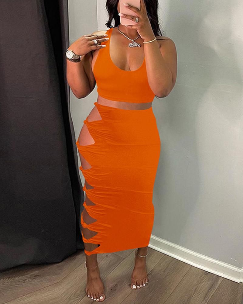 Style:Chic,Sexy Type:Skirt Sets Material:Polyester Neckline:U-Neck Sleeve Style:Sleeveless Length:Maxi Pattern Type:Plain Decoration:Cutout Fit Type:Skinny Occasion:Daily,Vacation Package Include:1*Skirt Set Hem Shaped:Straight Waist Line:High Waist