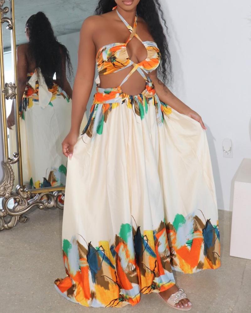 Style:Chic Type:Flared Material:97%Polyester,3%Elastane Neckline:Halter Sleeve Style:Sleeveless Length:Maxi Pattern Type:Tie Dye Decoration:Backless,Tied Detail Fit Type:Regular Occasion:Daily,Vacation Package Include:1* Dress Fabric Elasticity:Slight Stretch