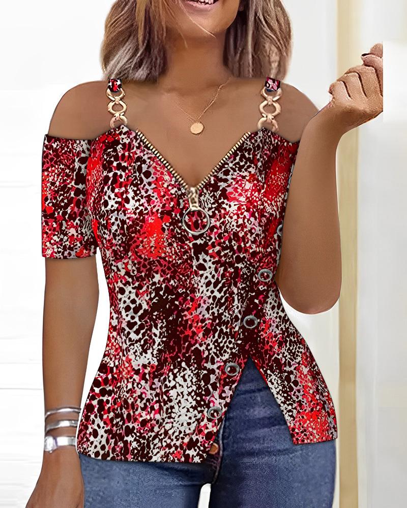 Style:Casual Type:Tee Material:Polyester Neckline:Cold Shoulder Sleeve Style:Short Sleeve Length:Regular Pattern Type:Leopard Decoration:Zipper Fit Type:Skinny Occasion:Daily Package Include:1*T-Shirt