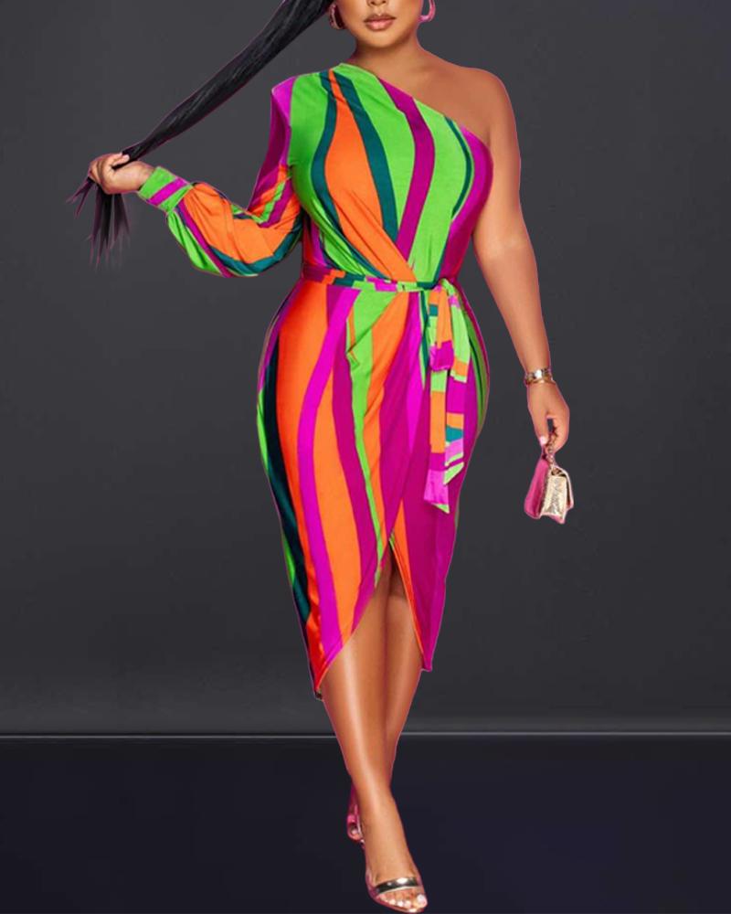 Style:Sexy Type:Straight Material:Polyester Neckline:One Shoulder Sleeve Style:Long Sleeve Length:Midi Pattern Type:Colorblock Decoration:Others Fit Type:Regular With Belt:Yes Occasion:Daily Package Include:1*Dress (With Belt) Fabric Elasticity:Slight Stretch Sheer:No Care Instructions:Machine wash or professional dry clean