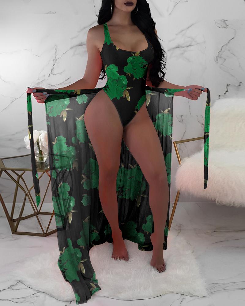 Animal Tropical Print Backless One Piece Swimsuit With Cover Up