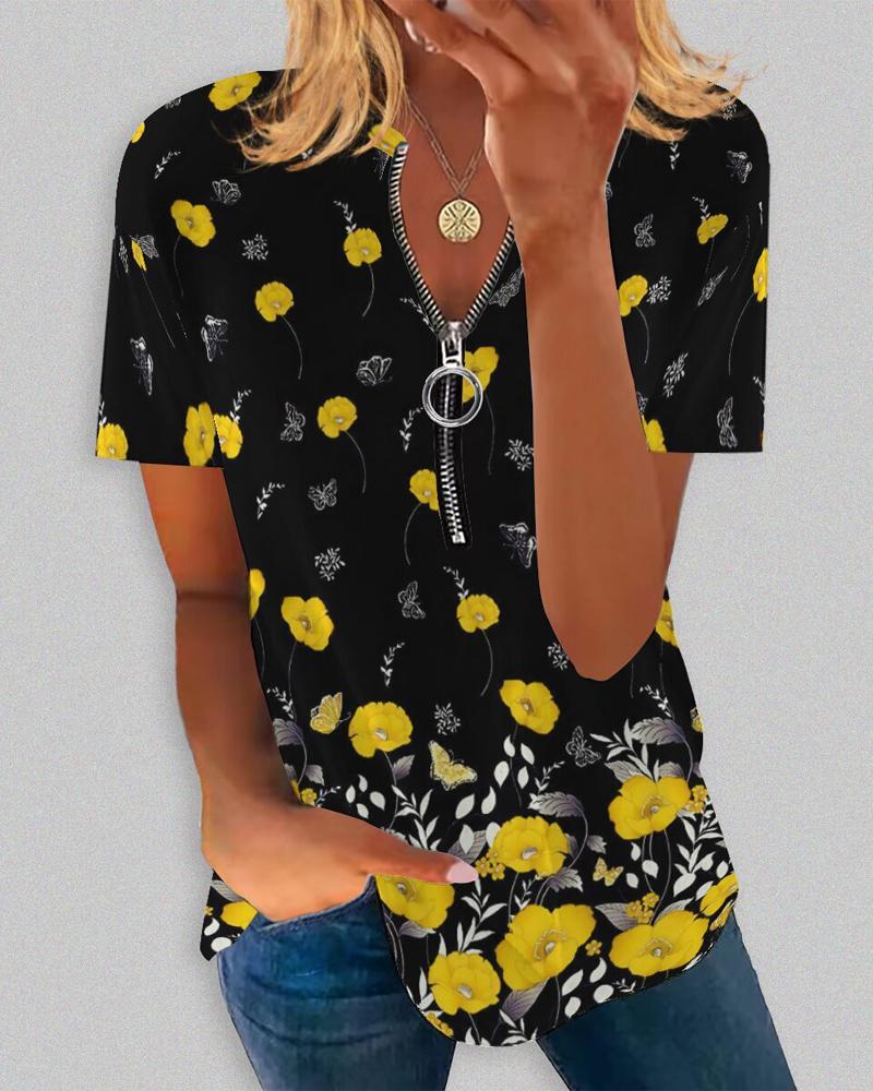 Floral Butterfly Print Zip Front Casual T-shirt